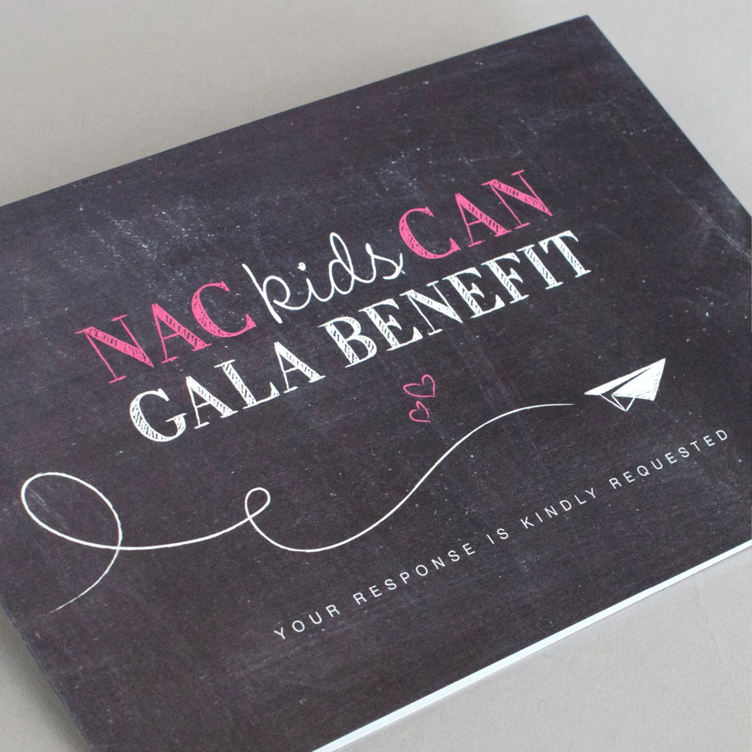 Event branding and print collateral for New Alternatives for Children’s annual NAC KIDS CAN Gala Benefit. With a chalkboard theme in mind, the invitation and accompanying pieces have a playful energy, filled with hand-drawn type and chalk-style doodles. The addition of a soft touch coating gives the pieces a more realistic chalkboard feel.