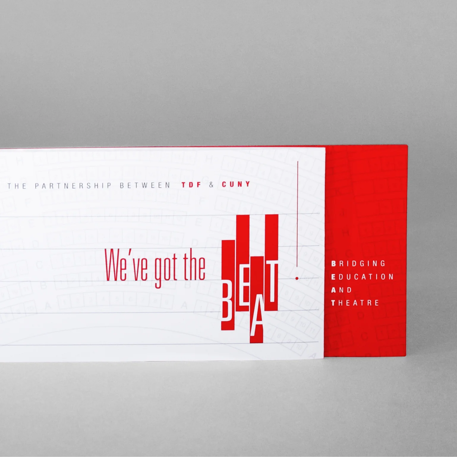 Branding and event collateral created for a fundraising gala, celebrating the collaboration between TDF and CUNY. The goal of the BEAT program is to bridge education and theatre, and inspire greater participation from students. The design combines elements from traditional education, music and theatre. Ruled paper, sheet music, and theatre seating charts make an appearance throughout the design in subtle ways.
